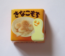 銀紙をあけると、きな粉のにおいがします。 口にぽいと放り込んむと、確かに感じはチロルチョコ。 一口かむと弾力があるおもちにあたります。